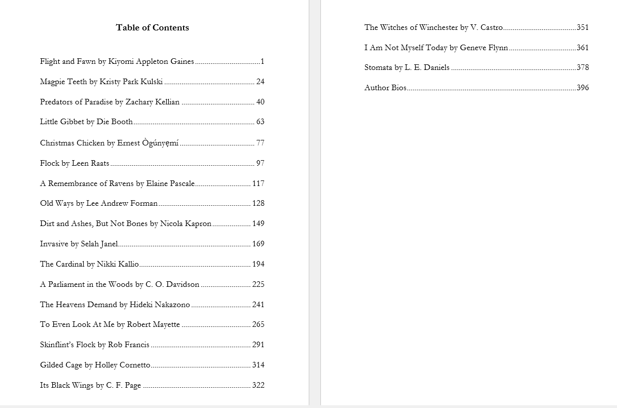 Here is the table of contents of the soon to be released Darkness Most Fowl. Feast your eyes on this lineup!